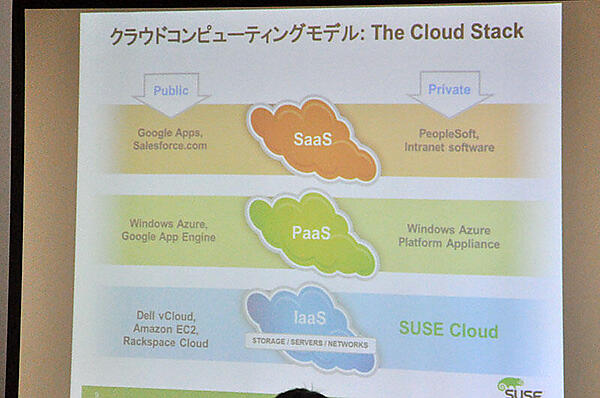 OpenStackは3つのクラウドコンピューティングモデル(SaaS、PaaS、IaaS)のうち、IaaSに位置づけられる。昨今、CanonicalやRed Hatはパブリッククラウドへのアプローチを取っているが、SUSE Cloudはエンタープライズを意識したプライベートクラウドにアプローチしている。