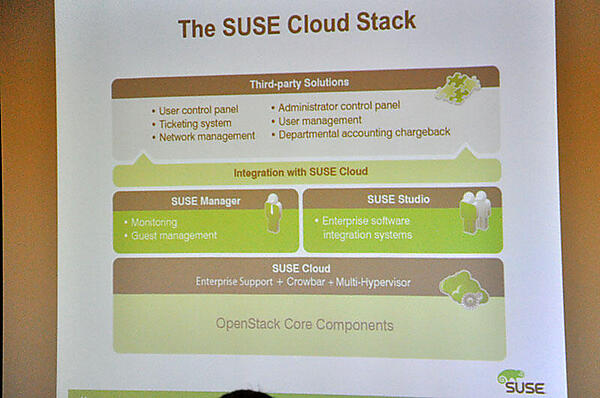 SUSE Cloudは、機能ごとに区分けされた各部分をパーツのような形で組み合わせて使う仕組みになっている。ベース部分はSUSE側が用意し、管理機能(SUSE Manager)や、イメージの作成・デプロイの機能(SUSE Studio)も提供しているが、サードバーティ製品も使えるため、ユーザーの要望に合わせたクラウドの構築が可能だ。