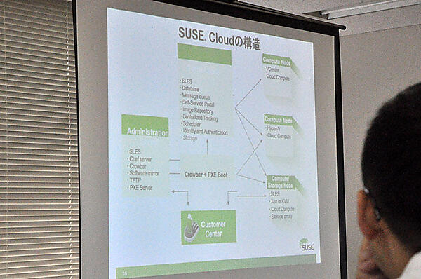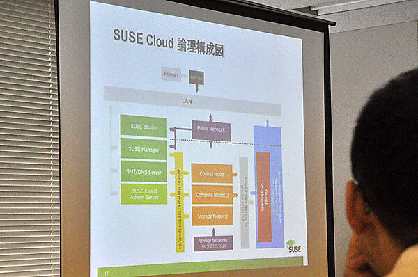 村川氏は続けてSUSE Cloudの構造と論理構成を紹介しながら、ユーザーが実際にセットアップするのはAdmin Serverのみで、インストール後はGUI形式が使えるため、操作が簡単だと説明した。マルチハイパーバイザーで、vSphere 5.1とHyper-V、Xen、KVMをサポートしている。現在はHavanaベースのSUSE Cloud 3(HA)がリリースされており、7月下旬には、IcehouseをベースにしたSUSE Cloud 4のリリースを予定している。