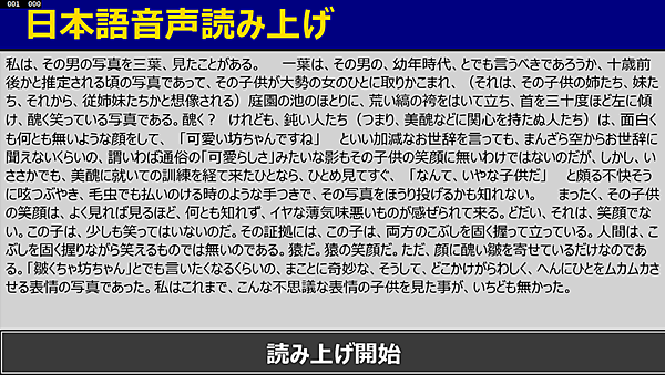 リスト3を実行すると図4のように表示されます。[読み上げ開始]ボタンをクリックすると、女性の声で文章が読み上げられます。読み上げ精度はおよそ90%といったところで、中には間違った読み方をする漢字もあります。