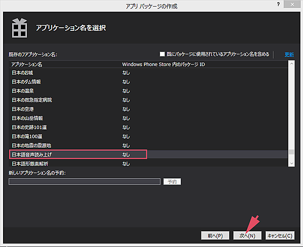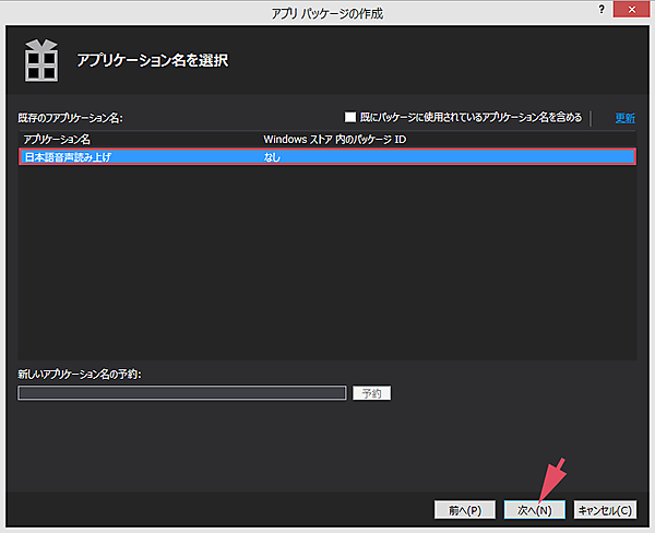 まず、「Speech(Windows 8.1)」プロジェクトを選択して、マウスの右クリックで表示されるメニューから[ストア]−[アプリパッケージの作成]を実行します。表示される画面に従って進めればアプリパッケージは作成されますが、「アプリケーション名を選択」画面では、最初に登録した「日本語音声読み上げ」が表示されますので、これを選択してください(図4)。