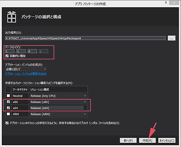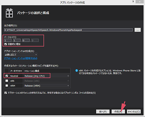次に、「Speech.WindowsPhone(Windows Phone 8.1)」プロジェクトを選択し、マウスの右クリックで表示されるメニューから[ストア]−[アプリパッケージの作成]と選択します。そのまま表示される画面に従って進めます。