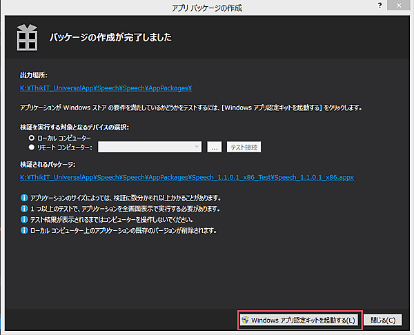 すると、先ほどの「Speech(Windows 8.1)」の時と同じように「パッケージの作成が完了しました」と表示され、[Windows アプリ認定キットを起動する]ボタンが表示されますので、これをクリックします。