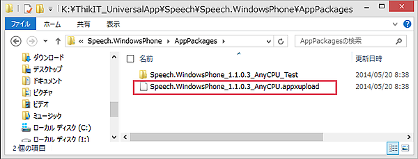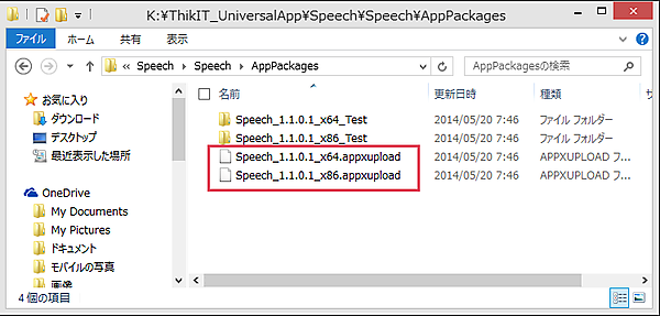 これで、「Speech(Windows 8.1)」のパッケージファイルが作成されました。「Speechプロジェクト」フォルダー内にAppPackagesというフォルダーが作成され、その中に、「.appxupload」という拡張子のファイルが作成されます。申請する場合は、このファイルをアップロードします(図8)。