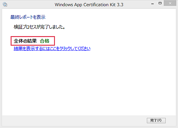 パッケージの作成完了の画面が表示されます。次は[Windowsアプリケーション認定キットを起動する]をクリックします(図6)。認定キットで合格しなければWindows ストアへの申請はできませんので、この処理は必ず行ってください。