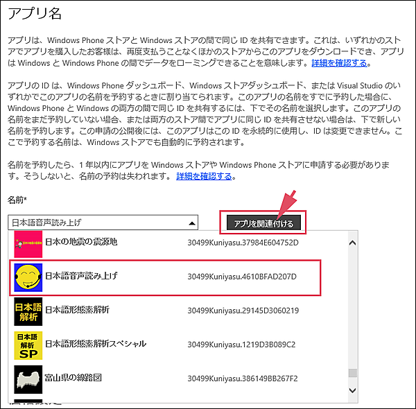 続けて、「名前」にある一覧リストから「日本語音声読み上げ」を選択し、[アプリを関連付ける]ボタンをクリックします。これを忘れると申請ができませんので、注意してください(図16)。