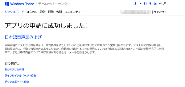 この後メールをチェックするとアプリを受け付けた旨のメールが来るはずなので、メールをチェックしたところ、Windows ストアとWindows Phoneから、もう認定されたとのメールが来ていました。