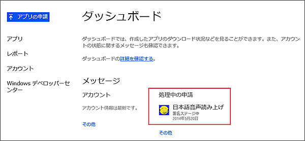 ダッシュボードに移動すると図20のように、申請したアプリが「処理中の申請」に表示されています・