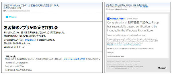 ちなみに、以前は認定に数日かかっていたのが、1時間もかからないうちに認定され、筆者も驚きました。届いたメールを図21で紹介します。左がWindowsストアで右がWindows Phoneの認定メールです。