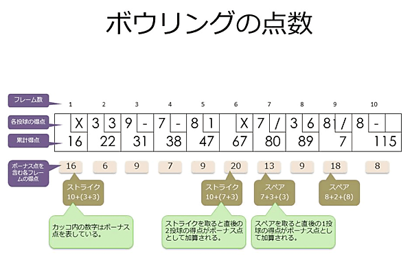 - [古谷] えーっとストライクを取ると直後の2投球の特典が加算されて、スペアは直後の1投球が加算されて…。