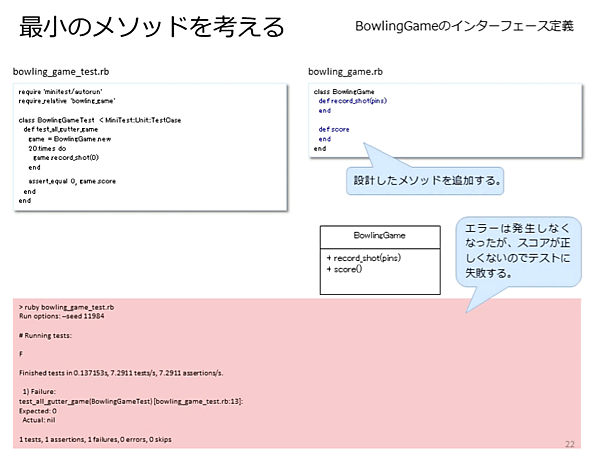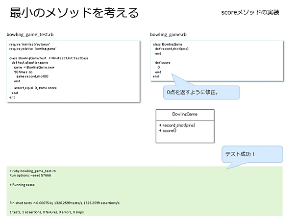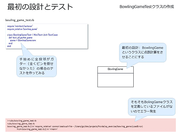 - [古谷] なるほど!で、それを、bowling_game.rbのBowlingGameクラスに定義する前にbowling_game_test.rbに記載して、まずテストをするわけですね!