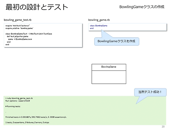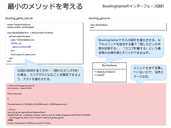 - [高梨] そうです!では、まずそのテストケースからテストしてみましょうRubyの1.9.3以上がインストールされているWindowsもしくはLinux等Rubyが動く環境に、適当にフォルダを作成してbowling_game_test.rbというテキストファイルをUTF-8で新規作成した後、ひたすらこちらを写経して、実行してください。