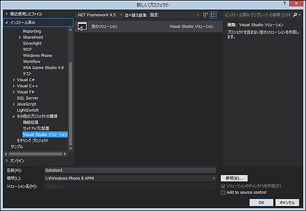 今回のユニバーサルアプリの作成では、無料版、Visual Studio 2013 Express for Windows(以下VS2013 Express)では作成ができないようです。何故なら、VS2013 Expressでは、次の図を見るとわかるように「Visual Studioソリューション」から「空のソリューション」を作成できないからです。おそらく、Visual Studio 2013 Professional以上の開発環境が必要ではないかと思われます(図1と図2参照)。