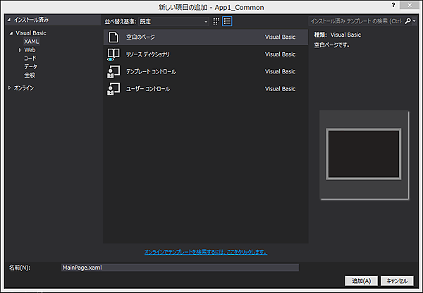 [追加]ボタンをクリックします。すると、ソリューションエクスプローラー内の「App1_Common(移植可能)」プロジェクト内に「MainPage.xaml」と「MainPage.xaml.vb」が作成されます。この中にコードを記述します。