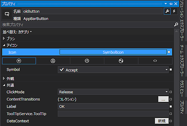 (7)AppbarButton要素を配置し、Iconプロパティに「Accept」、Labelプロパティに「OK」と指定する。このプロパティは図15の方法で設定できる。AppbarButtonを選択し、プロパティの[アイコン]ペインを展開して表示されるSymbolに「Accept」を選択し、[共通]ペイン内のLabelに「OK」と指定する。