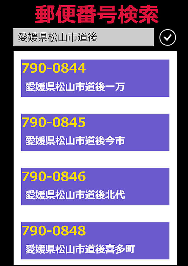 これで、入力した住所に該当する郵便番号が、住所とともに表示される。
