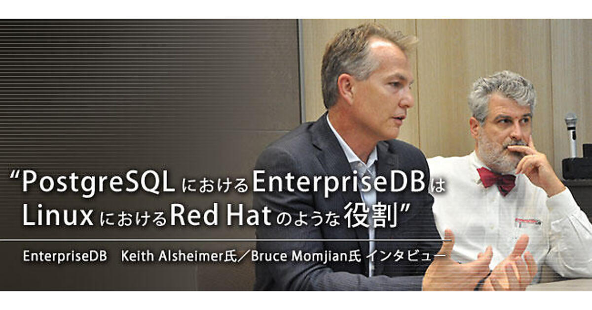 EnterpriseDB Summit Tokyo 2014に、EnterpriseDB社CMOのKeith Alsheimer氏と、同社シニアデータベースアーキテクトでありPostgreSQL開発グループの共同設立者/コアメンバーでもあるBruce Momjian氏が来日した。EnterpriseDB社とPostgreSQLについて、二人へのインタビューでの言葉に、それぞれの基調講演での言葉を合わせて紹介する。
