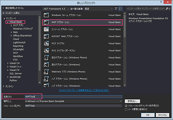 まずVS2013を起動します。[ファイル]ー[新規作成]ー[プロジェクト]と選択し、Visual Basicから「WPF アプリケーション」を選択します。「名前」には今回は適当に「WPFTest」と付けておきましょう(図13)。