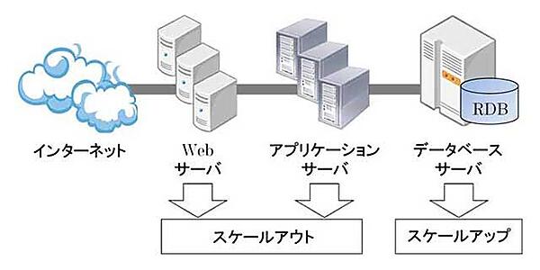 一般的なWebシステムは図1のような3階層アーキテクチャを採っています。Webシステムへの負荷が増大した場合、Webサーバやアプリケーションサーバは物理マシンの追加(スケールアウト)により負荷分散するのが一般的です。これに対してデータベースサーバ(RDB)では、物理マシンが持つハードウェアリソースの追加・増強(スケールアップ)が一般的です。
