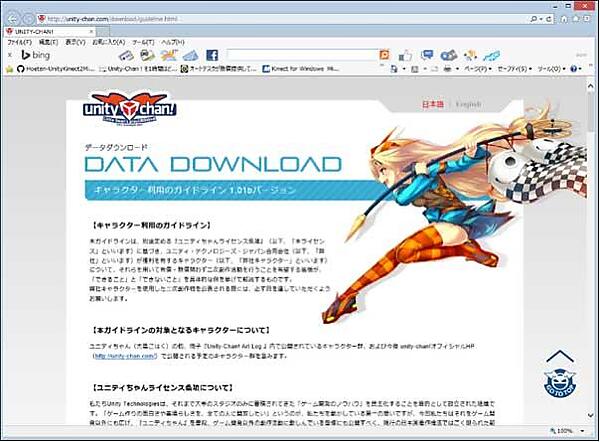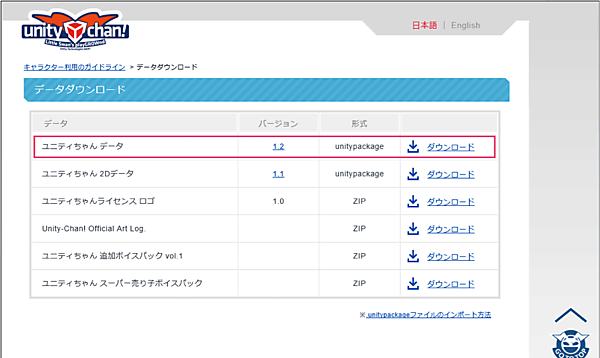 「ダウンロード」ボタンをクリックすると、「データダウンロード」ページが表示されます(図6)。このページから「ユニティちゃんデータ」のバージョンが「1.2」のunitypackageをダウンロードして下さい。 ダウンロードされるファイル名は「unityChan.unitypackage」というファイルになります。