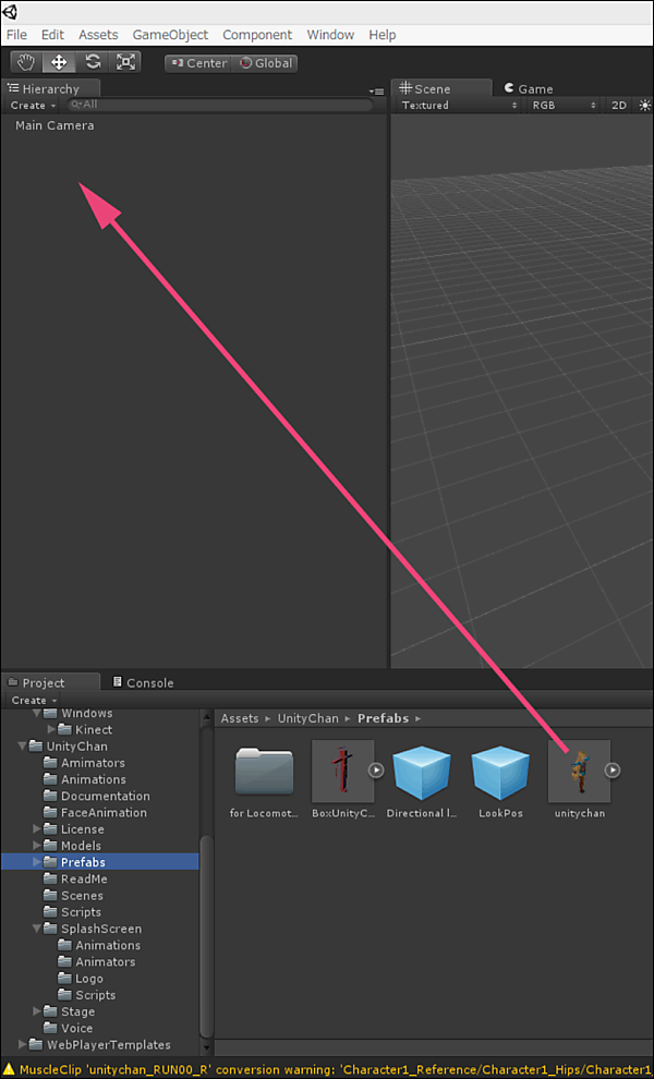 まず、図11の3内の「Project」にある「UnityChan」フォルダ内の「prefabs」フォルダにある「unitychan」を2の「Hierarchy」内にドラッグ&ドロップします(図13)。