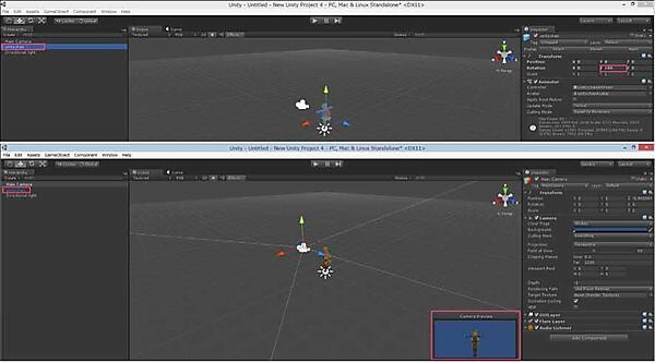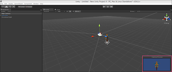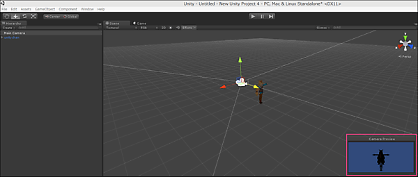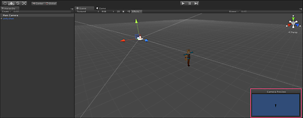 Unityちゃんがどのようにカメラに映っているかは、カメラのアイコンをクリックして確認します。画面の右下に「Camera Preview」が表示されます(図15)。