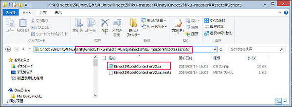 ダウンロードしたUnityKinect2Miku-master.zipを任意のフォルダに保存後、解凍します。解凍した「Assets/Scripts」フォルダ内に、「Kinect2ModelControllerV2.cs」というC#のファイルがあります(図2)。