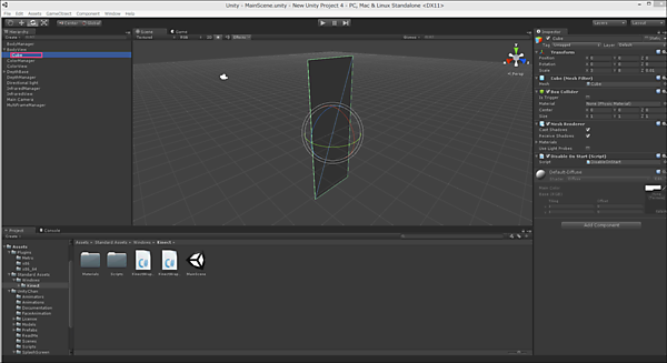 Unityの「Project」タブの「Standard Assets/Windows/Kinect」フォルダ内にある、「MainScene.unity」というファイルをダブルクリックします。すると「Hierarchy」の中に各種ファイルが追加され、「Scene」画面には「Cube」が追加されています。「Cube」とは、立方体の構成要素を表します(図4)。