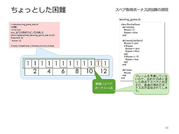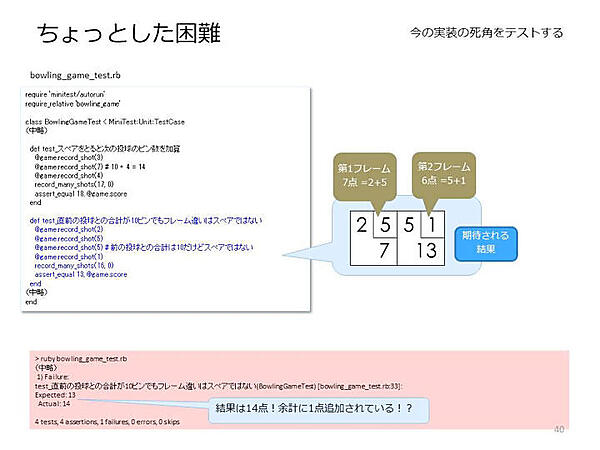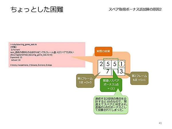 - [高梨] それはまさに、先程古谷さんが言っていた通りだと思います。2投目と3投目の合計は10点ですが、フレームが違うのでスペアにはなりません。ですが、今のプログラムでは、その判断を行っていません。