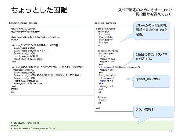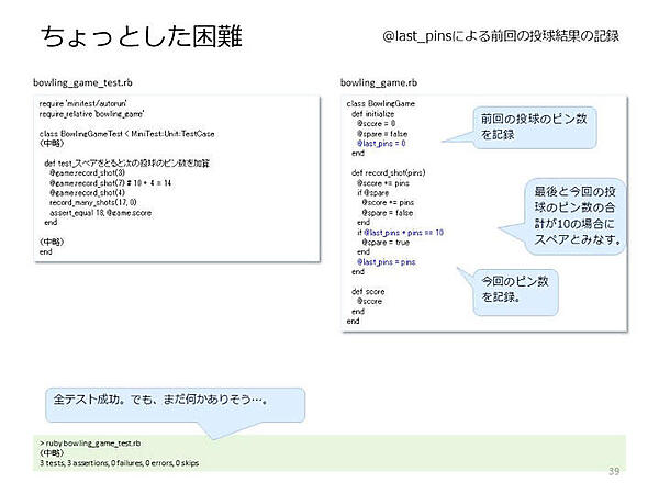 - [古谷] そうですね…… つまり、今までの「合計が10になった時点」でフラグをセットするのではなくて、前回倒したピン数を覚えておいて、「前回と今回倒したピン数の合計が10ピンの時」だけスペアフラグをセットするようにするのはどうでしょう?