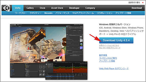 Unityの現行バージョンである「Unity4」は、下記のサイトよりダウンロードできます。