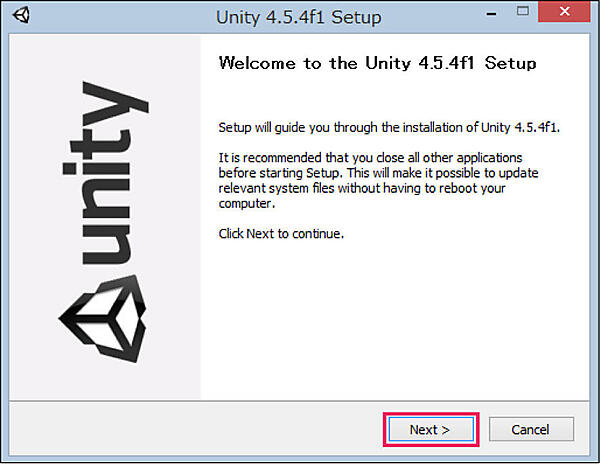 任意のフォルダ—にダウンロードした「UnitySetup-4.5.4.exe」をダブルクリックすると、インストールが開始されます(図2)。