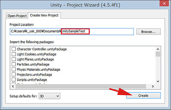 まずは「Project Location」に適当なプロジェクト名を入力して「Create」ボタンをクリックします。ここではプロジェクト名に「UnitySampleTest」と入力して「Create」ボタンをクリックします(図4)。