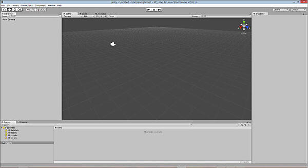 Unity4の新規プロジェクト(UnitySampleTest)の画面が起動します(図5)。
