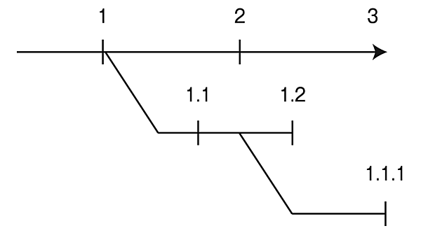 最もよく使用されているソフトウェアの番号付けの方法は、自然数を基にはしていません。代わりに、ドットで区切られた10進システムを使用します。これは、ソフトウェア開発における非直線、つまり、単一方向への開発ではなく、バグ修正リリースやバグ修正リリースのバグ修正リリースなどを表す多くのブランチへ対応するために必要です。図1で示すように、バージョン2よりも機能が少ないと想定される1.1.1などのバージョンが、実際にはバージョン2より後にリリースされる可能性もあります。