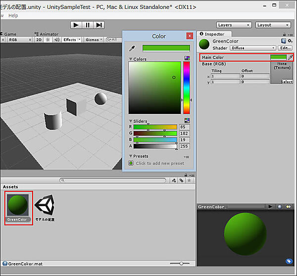 「GreenColor」を選択し、表示される「Inspector」の「Main Color」の、「白い空白」部分をクリックします。すると「Color」画面が起動しますので、「Green系統色」を選択してください。画面上の「グレーの球体」が「Green系統色」に変化します(図7)。
