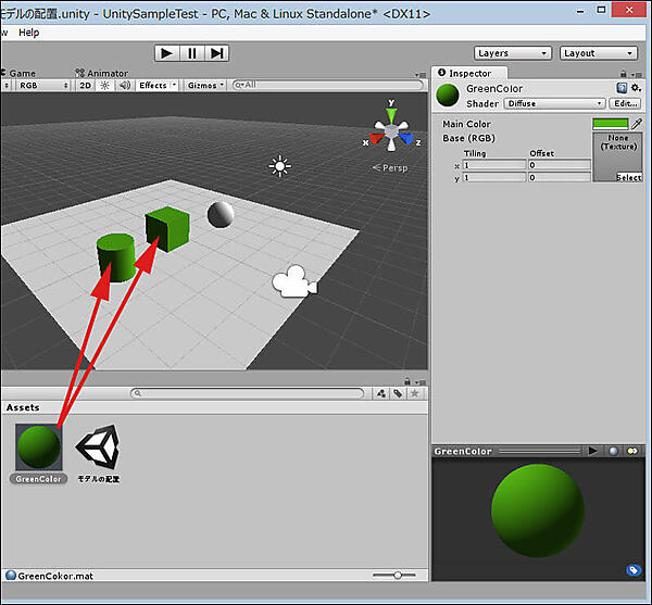図7の状態から、「GreenColor」マテリアルを「Cylinder」と「Cube」の上にドラッグ&ドロップすると、それらのモデルが「Green系統色」に変化します(図8)。