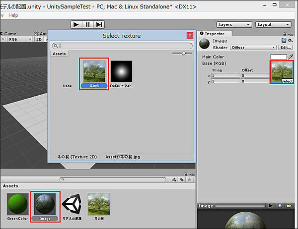 次に「Image」マテリアルを選択し、「Inspector」内の図10の赤で囲んだ「Select」をクリックします。