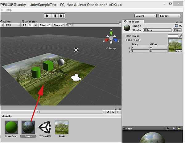 この「Image」を「Plane」の上にドラッグ&ドロップすると、「Plane」に画像が貼り付けられます(図12)。