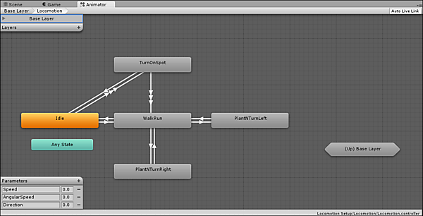 各種の「State」(状態)が、矢印付きの線で結ばれて表示されます。「Animator」はUnity4から追加された「Mecanim」のコアとなる機能で、アニメーションシステムを管理する仕組みになります。この画面には、アニメーションの「State」と「Transition」(遷移)が表示されています(図20)。