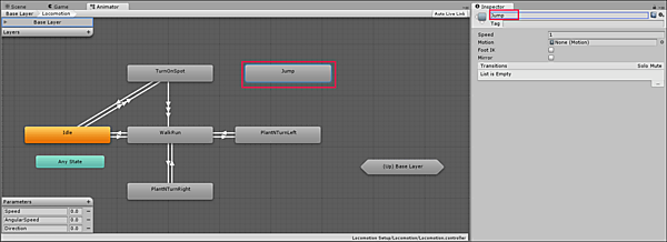 次に、画面上の何もないところでマウスを右クリックし、表示されるメニューから[Create State]ー[Empty]と選択してください。すると、「New State」という新しい「State」が作成されます。「New State」を選択し、[Inspector]で名前を「Jump」に変更します(図21)。