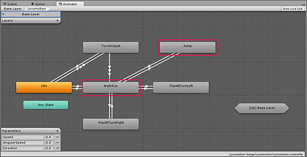 次に、「Jump」の「State」を選択し、マウスの右クリックで表示されるメニューから、「Make Transition」を選択します。すると矢印線が出てきますので、「WalkRun」の「State」と結びつけます。今度は「WalkRun」を選択して、同じ手順で「Jump」と結び付けてください(図22)。