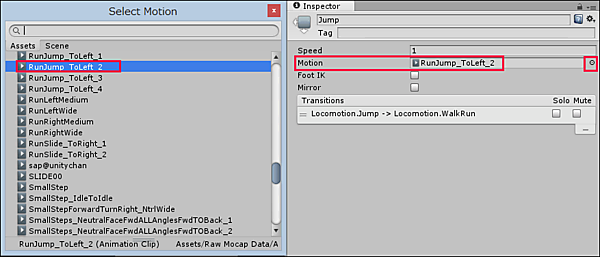 最後に、「Jump」の「State」を選択し、「Inspector」内の「Motion」の横にある小さな「◎」をクリックして「Select Motion」画面を表示し、一覧の中から「RunJump_ToLeft_2」を選択します(図24)。