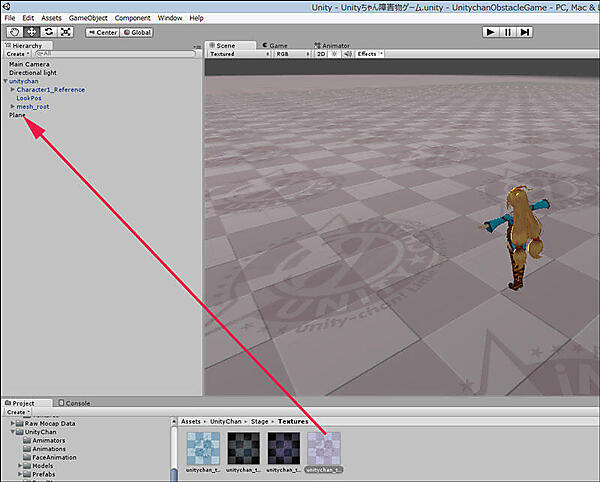 「Plane」が真っ白のままだと、Unityちゃんが動いている様子がわかりにくいので、「Texture」を適用します。「Project」内の「Unitychan」フォルダー内の「Stage」フォルダーに「Textures」というフォルダーがあり、その中に4点ほど拡張子が「png」のファイルが入っています。今回はそのうちの「unitychan tile6.jpg」を「Hierarchy」内の「Plane」上にドラッグ&ドロップします。すると「Plane」に「Texture」が適用されます(図2)。