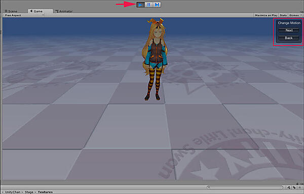 これで実行してみると、右上隅に「Change Motion」、「Next」、「Back」と書かれたボタンのようなものが表示されています(図3)。これはUnityちゃんを配置してプレイ画面で実行する際に、いろいろなポーズを試すためのボタンです。今回のようにUnityちゃんをスクリプトで操作する場合は、このボタンは不要ですので、「Inspector」にある「Idle Changer(Script)」を削除して、表示を消しておきましょう。
