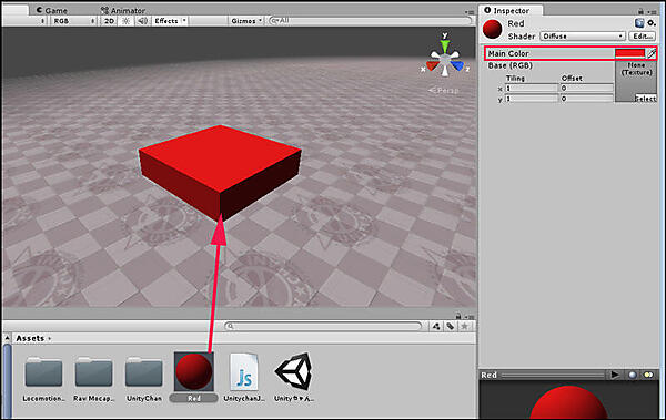 次に「Goal」の外見を設定していきましょう。まず「Project」の「Create」から「Material」を選択し、名前を「Red」としておきます。「Inspector」内の「Main Color」を「赤系統色」に指定し、「Cube(Goal)」上にドラッグ&ドロップします(図6)。