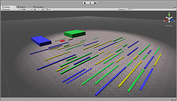 現状では「Cube」が白一色なので、「Cube」に「Material」を設定しましょう。「Project」の「Create」から「Material」を3個追加し、それぞれ名前に「Blue」、「Green」、「Yellow」と指定しておきます。各「Material」を選択して「Inspector」の「Main Color」にそれぞれ、「青系統色」、「緑系統色」、「黄系統色」を指定して、「Scene」上に配置している「Cube」に適当にドラッグ&ドロップしていきます(図10)。
