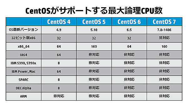 図4:CentOS 7では、最大160の論理CPUをサポートする。比較的中規模から大規模のSMPマシンを使用した仮想化システムにおいて大量のコアを同時に仮想マシンに割り当てるニーズが背景にある(クリックで拡大)