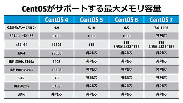 CentOS 7でサポートされる最大メモリ容量は、CentOS 6と同様に3TBで変わりありません。最近のx86_64アーキテクチャのハイエンドのSMPマシン(HP ProLiant DL580 Gen8等)では、最大メモリ搭載容量が6TB程度のものも登場しています。現時点でCentOS 7でサポートされる容量は3TBですが、理論的には64TBまで利用できる可能性があります。