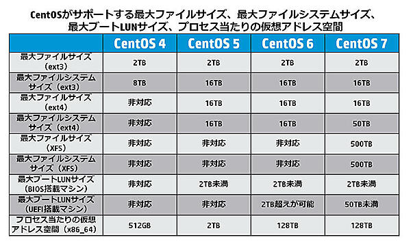 このようなビッグデータ向けに開発されたx86サーバーでは、1筺体で、内蔵ディスクが200TBを超えることも少なくないため、ext4に取って代わるファイルシステムの利用が期待されていました。今回、CentOS 7で、XFSが標準でサポートされるようになり、ビッグデータ基盤への対応が進みました。CentOS 7は、BIOSを搭載したサーバーだけでなく、UEFI(Unified Extensible Firmware Interface)への対応など次世代サーバー基盤を見据えたアーキテクチャになっており、CentOSコミュニティは、引き続きサーバープラットフォーム用のOSに特化した取り組みを行っています。UEFI搭載マシンは、OSのブートの仕組みが従来のBIOS機と大きく異なるため、注意が必要です。例えば、CentOS 6におけるBIOS搭載マシンのブート領域(最大ブートLUNサイズ)は、ハードディスクの2TB未満に配置する必要がありましたが、EFI搭載マシンにではその制限が設けられていませんでした。しかし、CentOS 7では、EFI搭載マシンの場合に、2TBの制限が撤廃されているものの、ブート領域を50TB以内に配置しなければならない制限が設けられています。サポートされる論理CPU数やメモリ容量、ファイルシステムサイズ等は、CentOS 7になり大幅に最大値が引き上げられています。